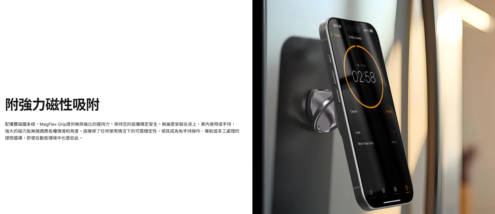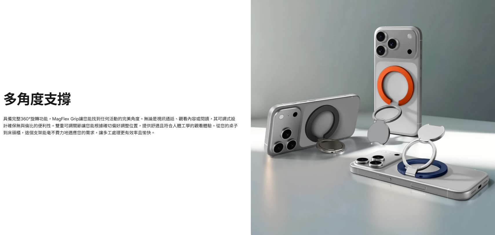 Titan Pro MagFlex Grip 支架結合了 360° 旋轉、雙磁鐵安全性和符合人體工學的握把,可形成滿足各種需求的多功能支架。無論是串流媒體、視訊通話還是免持瀏覽,它的靈活性都能確保最大的舒適度和可用性。這款多功能支架適用於任何環境,從家庭辦公室到汽車儀表板,它改變了您與設備的互動方式,使每個體驗都無縫且直觀。