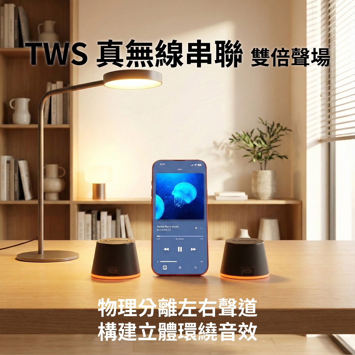 TWS 真無線立體聲:支援兩台音響串聯配對,打造立體聲環繞音效