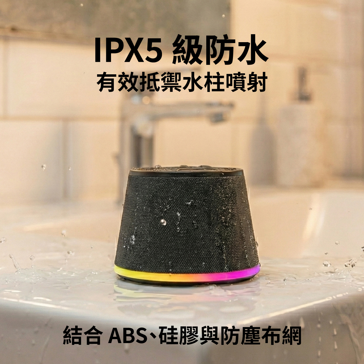 IPX5 防潑水設計:具備生活防水等級,適合浴室或戶外場景使用