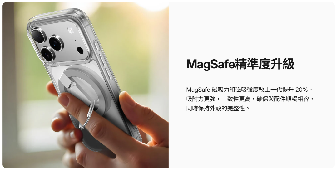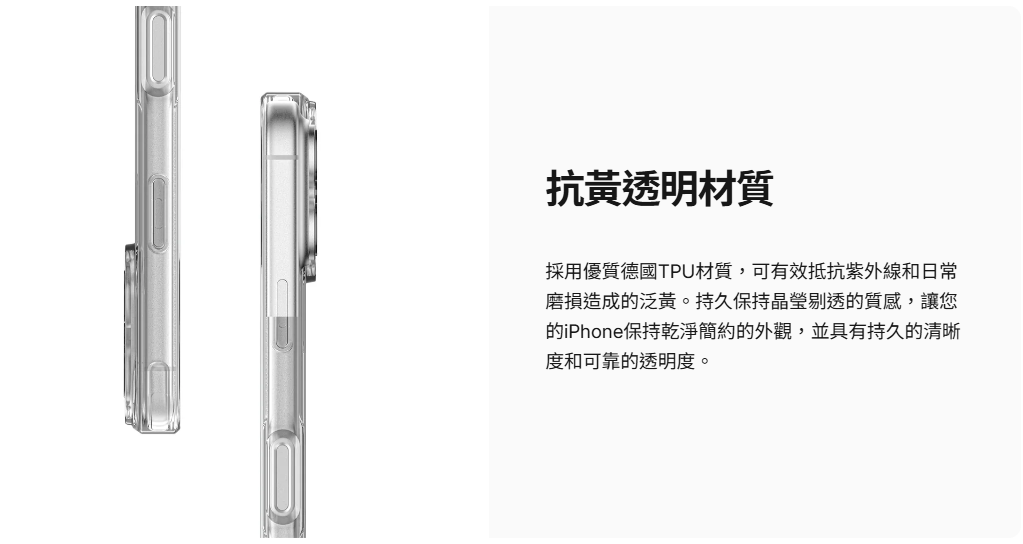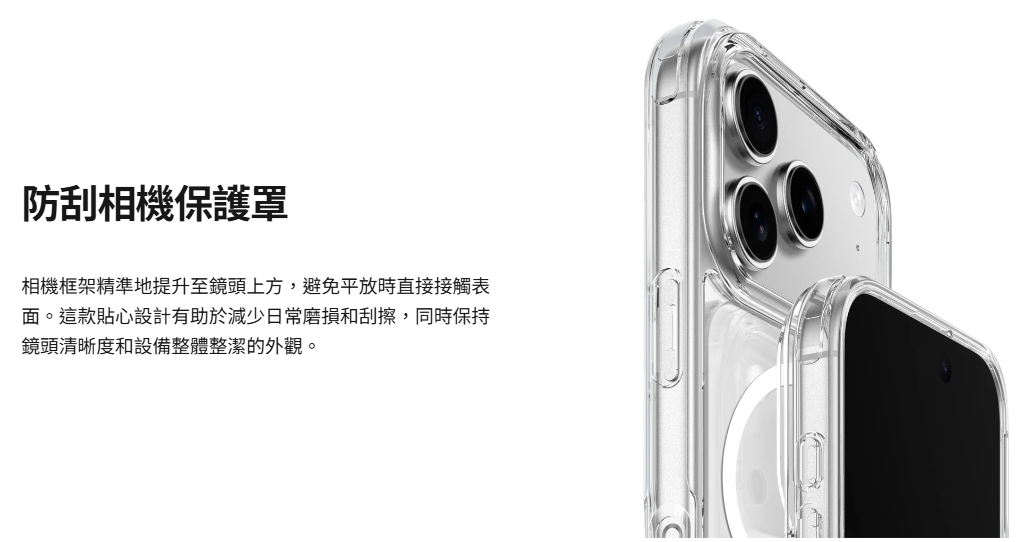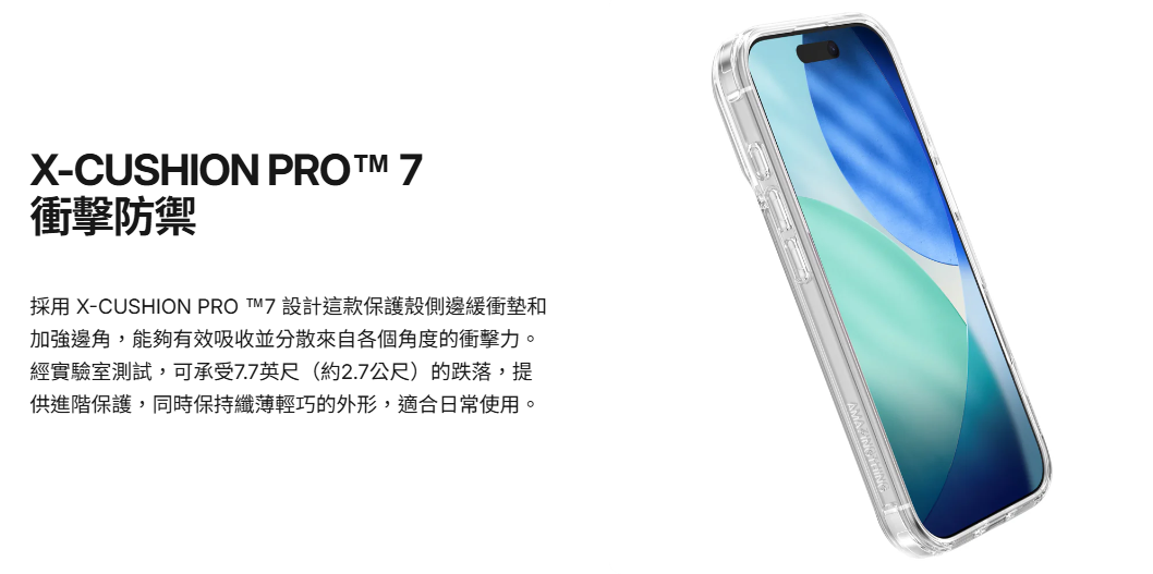 Minimal 以清透、精緻的外觀,專注於核心防護。從可承受 7.7 呎落摔的 X-CUSHION PRO 側邊氣墊與加強抗震角,到抗黃變並長保透亮的德國 TPU,每個細節都為耐用而生。加高鏡頭框能避免平放時的刮磨,而更強的 MagSafe 對位則帶來穩固且順暢的吸附體驗。