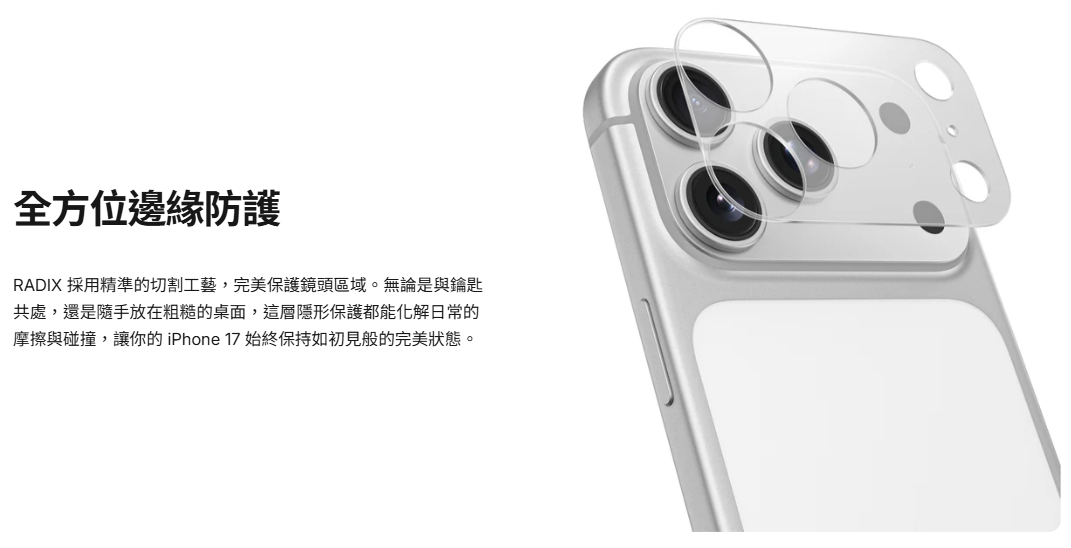 RADIX FullCover 磨砂保護貼專為 iPhone 17 Pro 及 iPhone 17 Pro Max 打造,採用磨砂纖薄的材質,全面覆蓋每個邊緣。