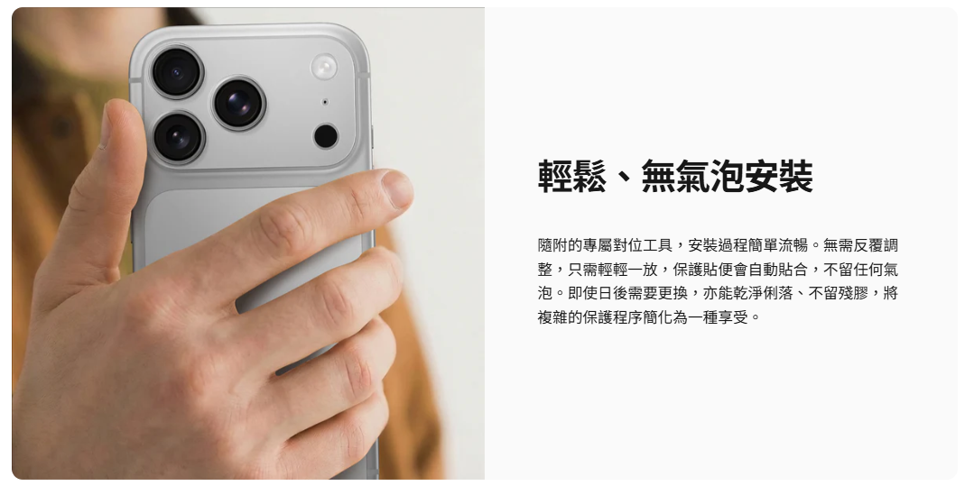 保持原有清晰度及光線平衡,防刮痕、防指紋、防油污。簡易安裝無氣泡,移除時不留殘膠,隨時更換。