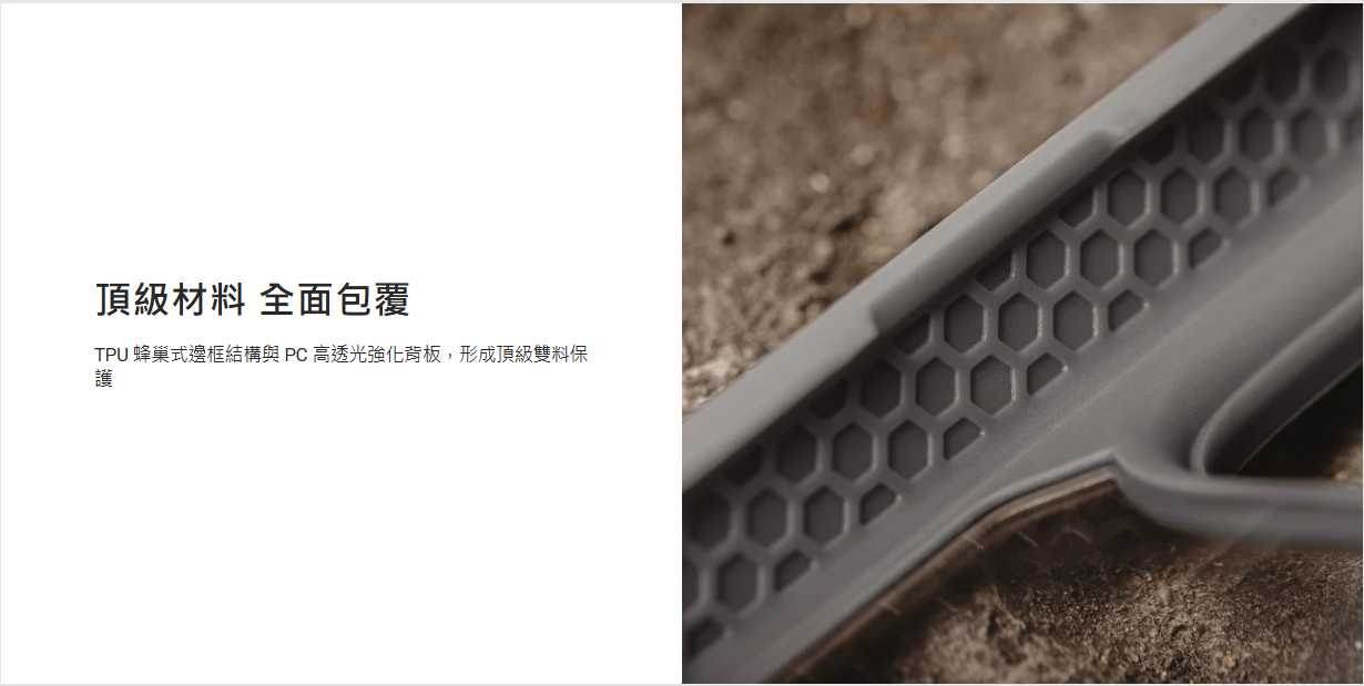 TPU 蜂巢式邊框結構與 PC 高透光強化背板,形成頂級雙料保護。