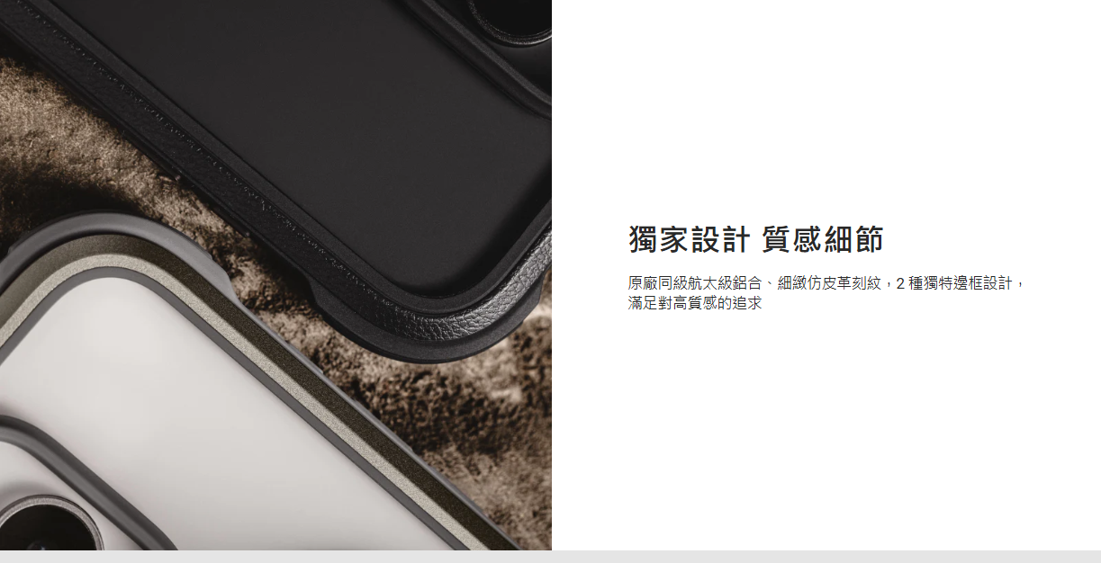 原廠同級航太級鋁合、細緻仿皮革刻紋,2 種獨特邊框設計,滿足對高質感的追求。