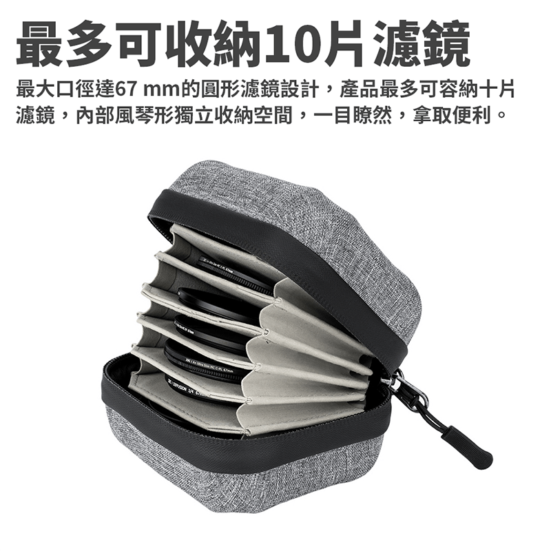 ◎ 可收納10片最大口徑為67mm圓形濾鏡