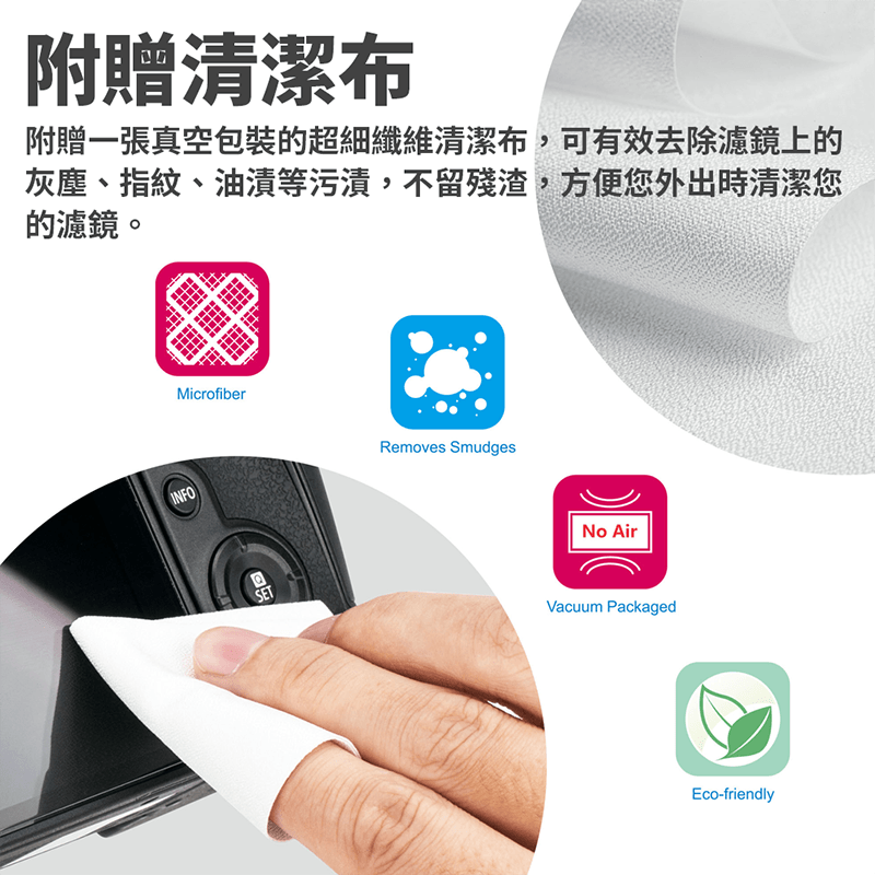 ◎ 附贈一張真空包裝的超細纖維清潔布,清潔拒留痕