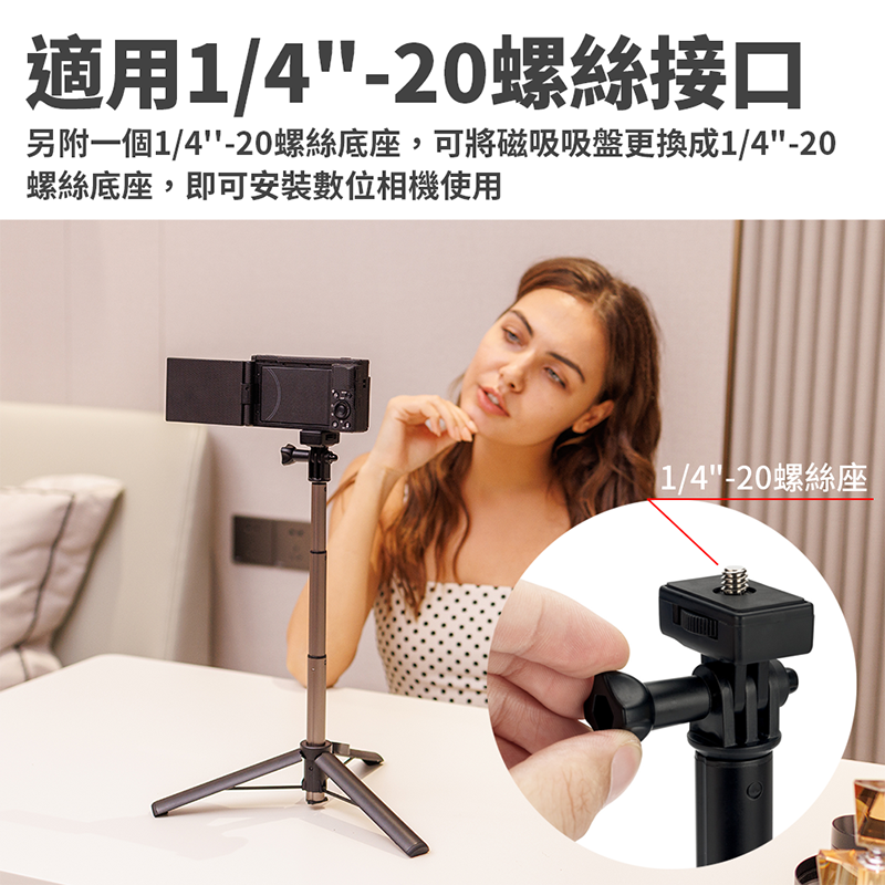 ◎ 1/4"-20螺絲底座支援帶有1/4"-20螺絲孔的相機、LED燈、麥克風等設備使用;也可直接安裝GoPro使用