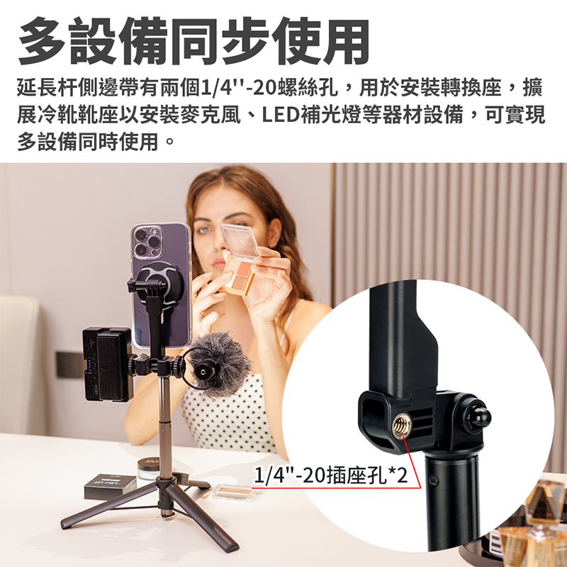 ◎ 延長杆側邊帶有兩個1/4''-20螺絲孔,用於安裝轉換座,擴展冷靴靴座以安裝麥克風、LED補光燈等器材設備,可實現多設備同步使用