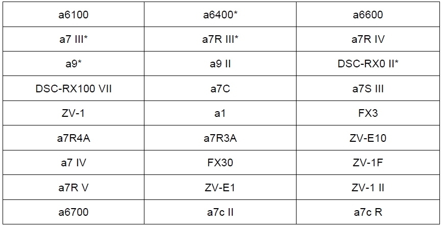 * a6400, DSC-RX0 II (通過更新攝像機系統軟體版本“Ver.2.00”或更高版本而受支援)。