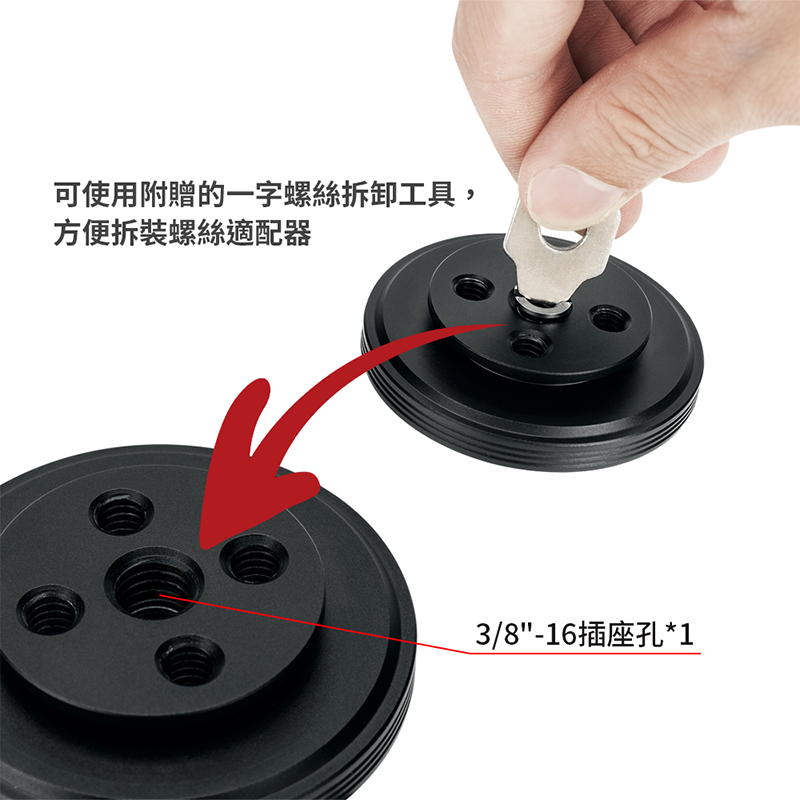 ◎ 中心孔為3/8"-16轉1/4"-20螺絲適配器(附一字工具協助替換),方便將標準3/8"-16螺母轉換為標準1/4"-20螺母使用。