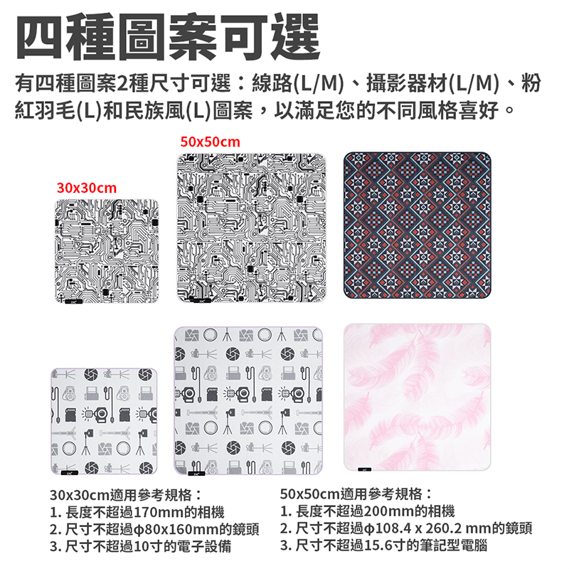 產品型號:SA-CBL(線路款)、SA-CL(攝影器材款)、SA-PFL(粉紅羽毛)、SA-MOL(民族風款)
