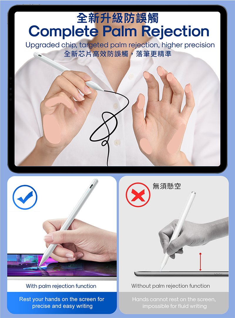 ◎ 全區防誤觸,在iPad上書寫時允許手掌和筆尖同時觸碰螢幕且不會有影響