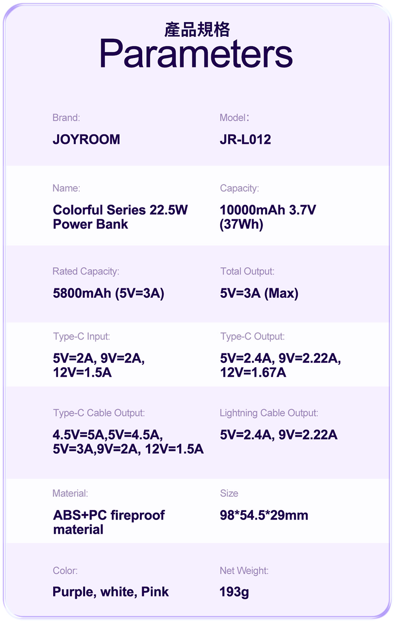 Type-C自帶線輸出:4.5V/5A;5V/4.5A;5V/3A;9V/2A;12V/1.5A (22.5W)