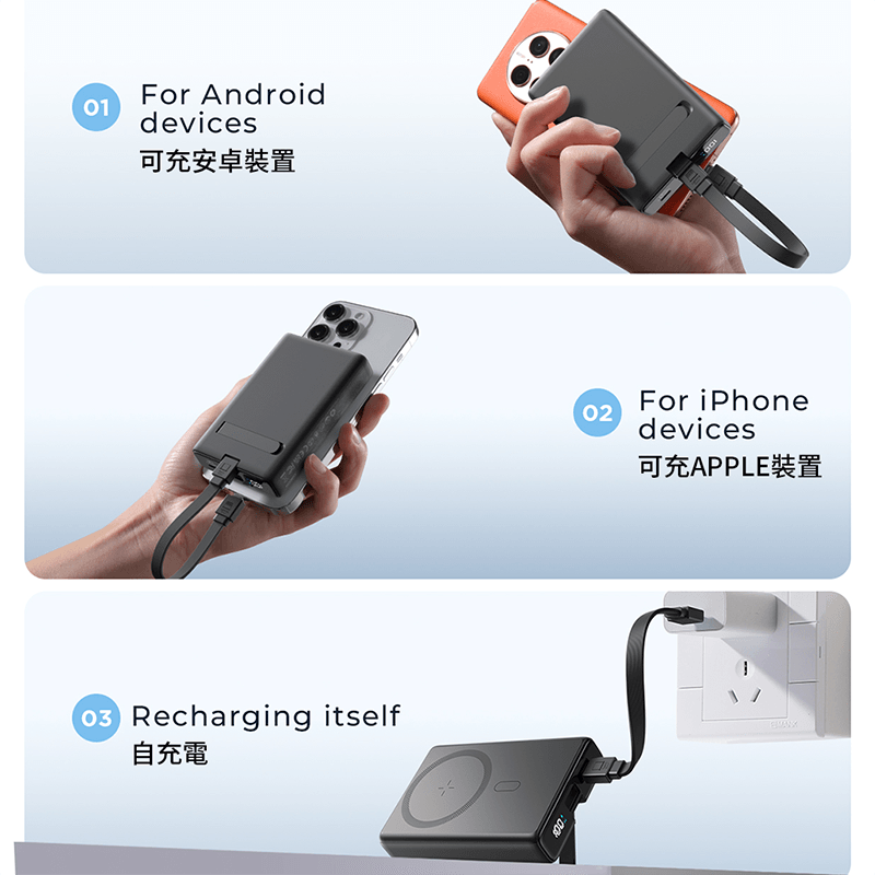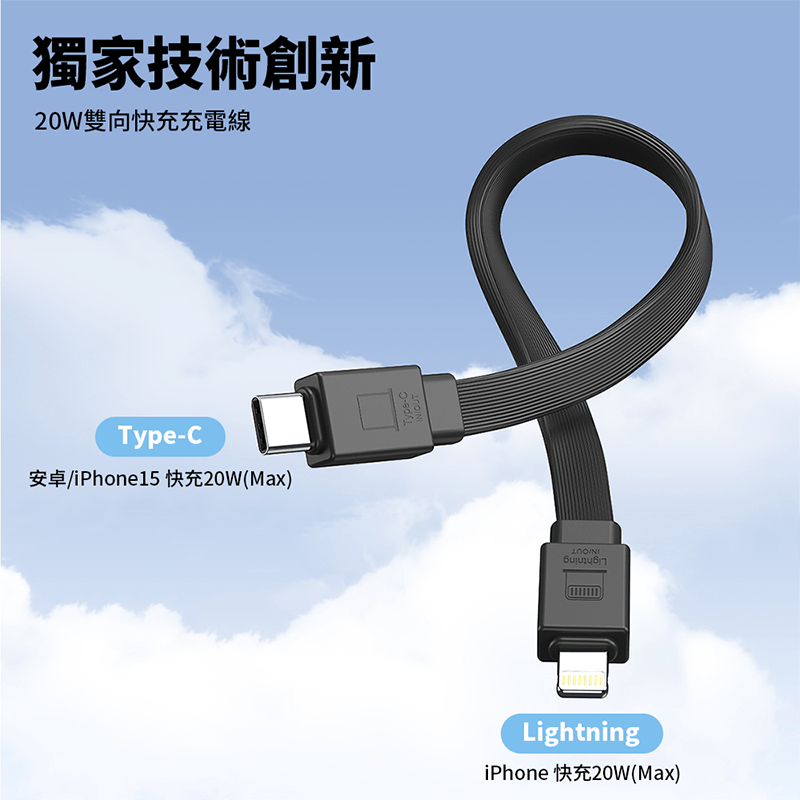 ◎ 可拆卸電纜,用於為 iP/Android 設備充電並自行充電