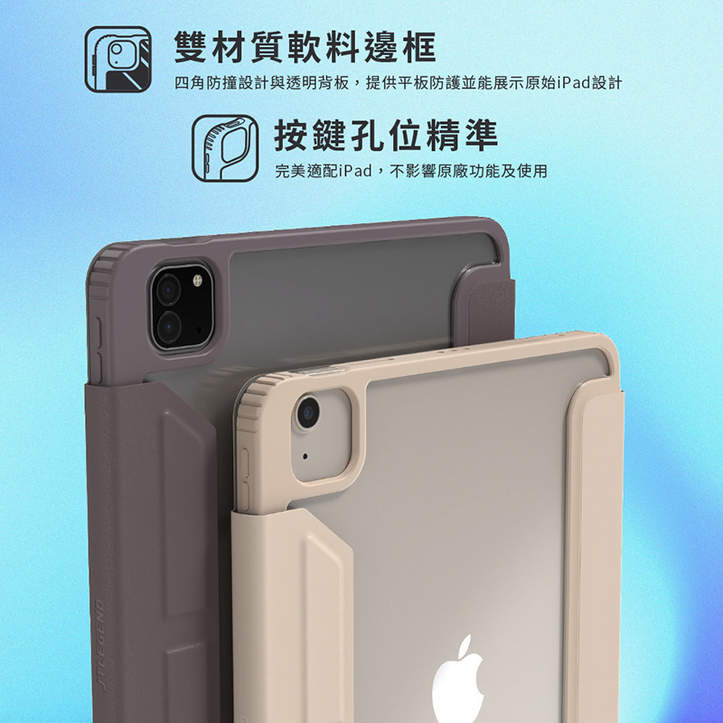 ◎ 雙材質軟料邊框 - 四角防撞設計與透明背板,提供平板防護並能展示原始iPad設計。