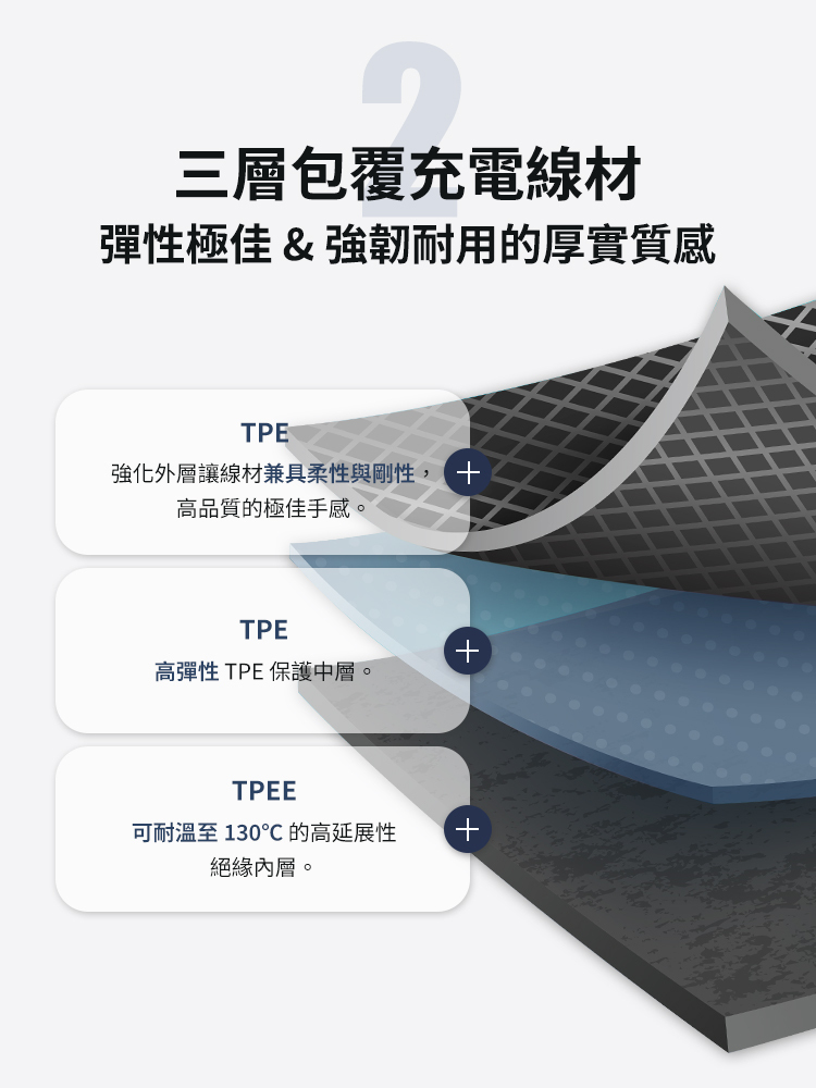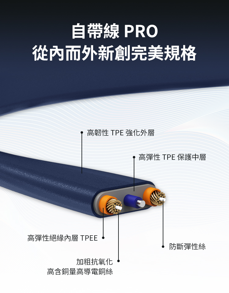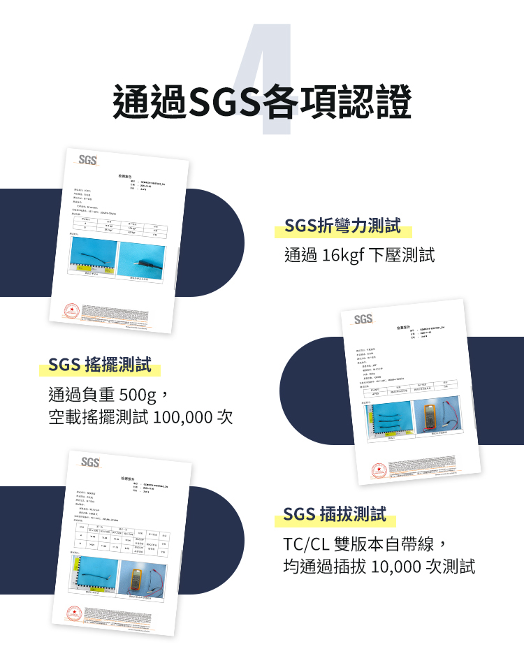 ・自帶線通過SGS 10萬次彎折/搖擺測試,為業界最高規格