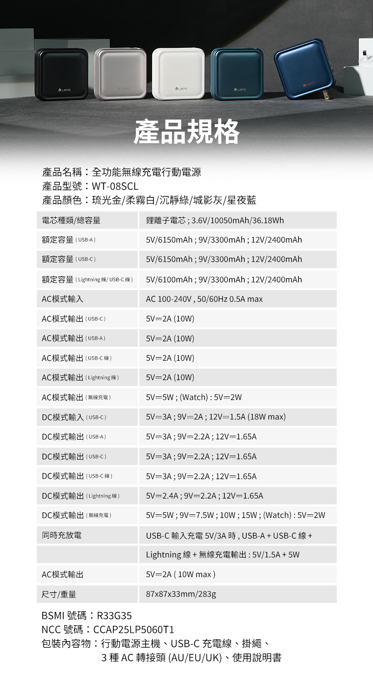 其他輸出(USB-A + USB-C 線 + Lightning 線 + 無線)為: