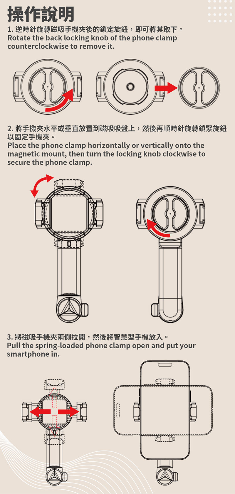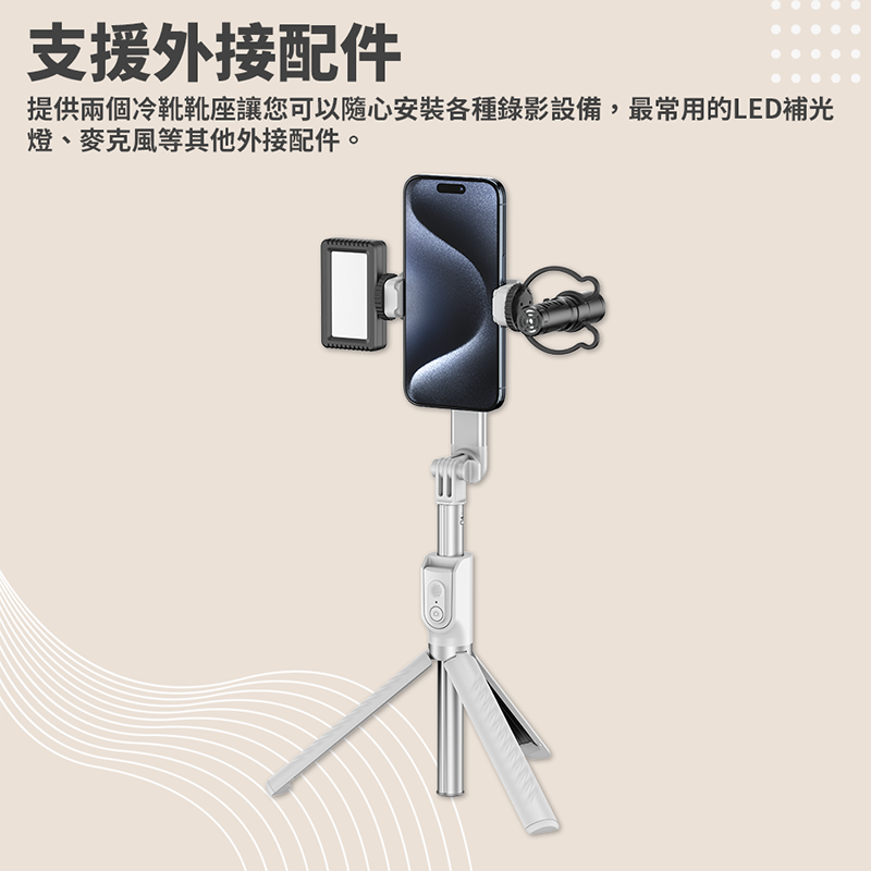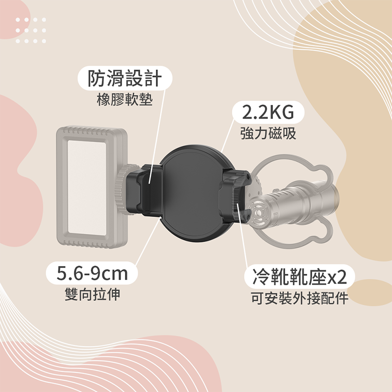 ◎ 手機夾具有強力磁吸,附有螺絲鎖可以牢牢鎖在自拍棒上