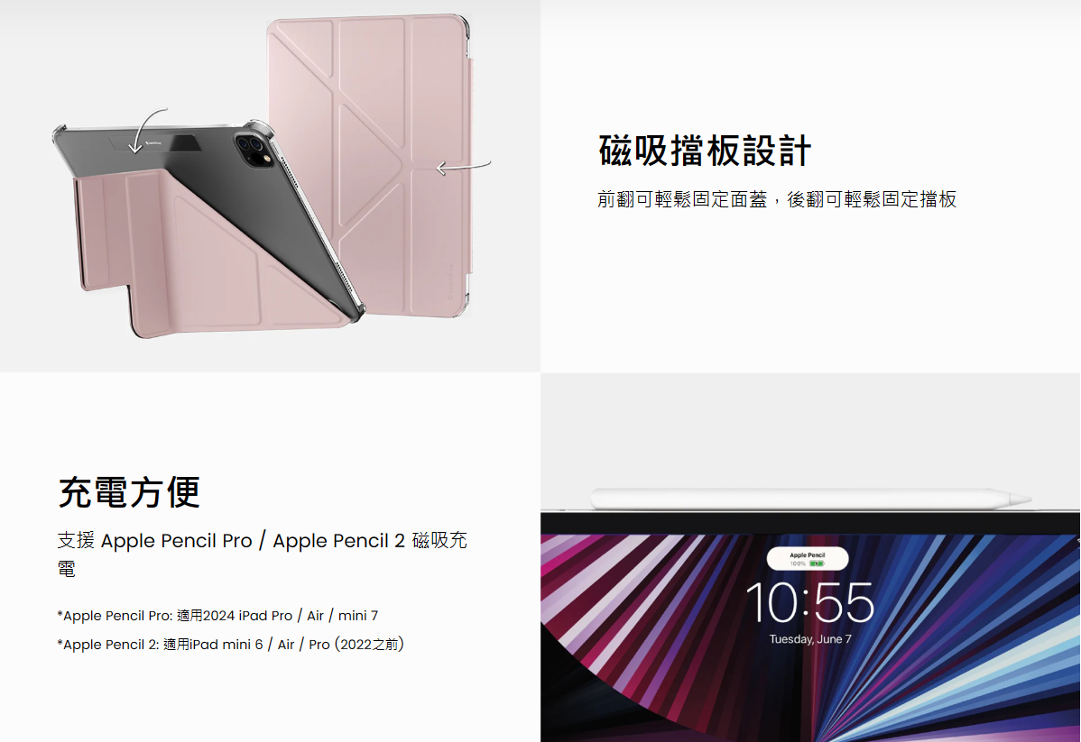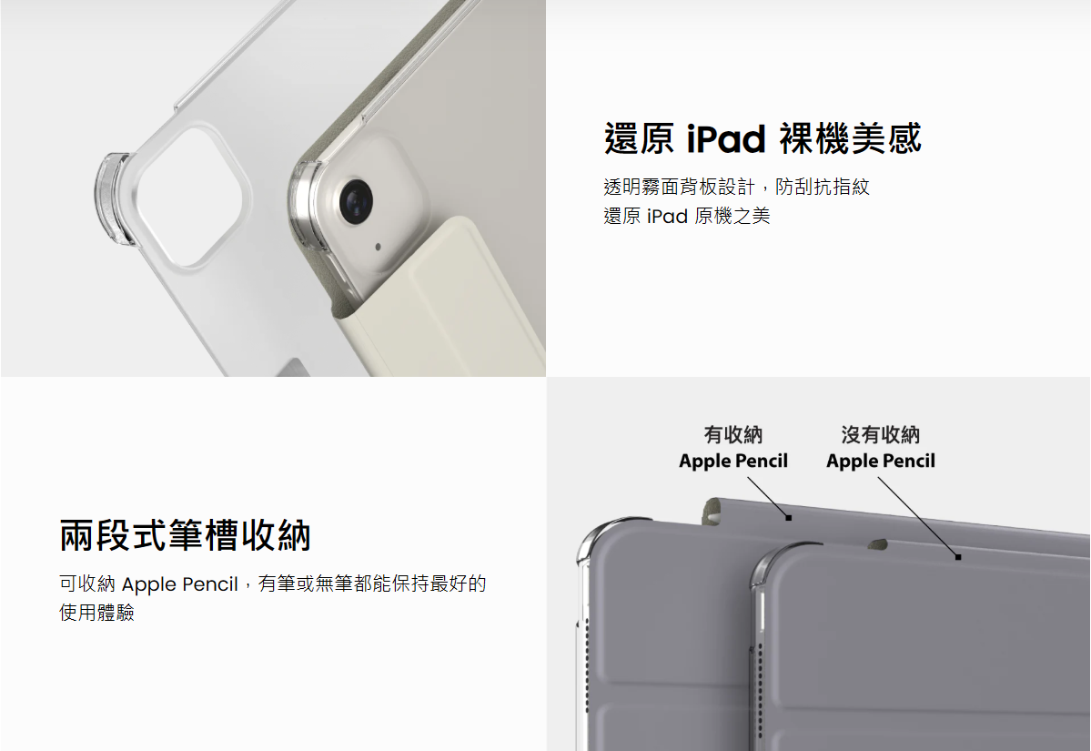 Origami Nude 多功能透明保護殼,採用透明霧面背板,防刮抗指紋。內建折疊支架,提供 4 種不同的折疊及支撐方式,可任意變換使用角度,滿足多種情境。翻蓋式自動喚醒功能,滿足 iPad 重度使用者的日常所需。磁吸外扣的置筆設計,方便收納觸控筆的同時也能保持精簡外觀。