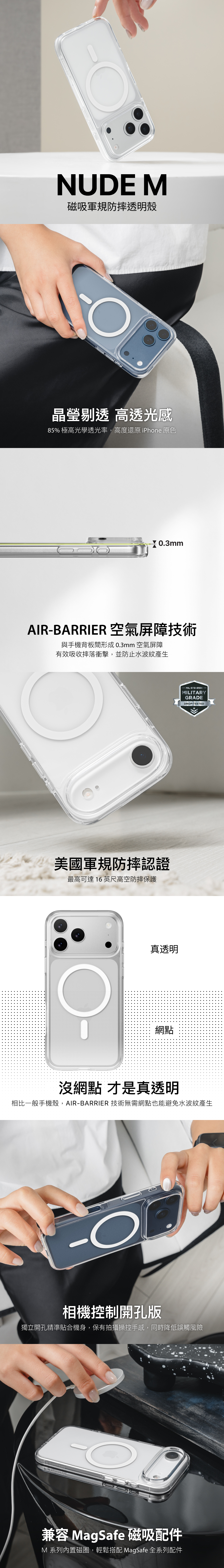 •AIR-BARRIER 空氣屏障技術:與手機背板間形成 0.3mm 空氣屏障,有效吸收摔落衝擊,並防止水波紋產生。