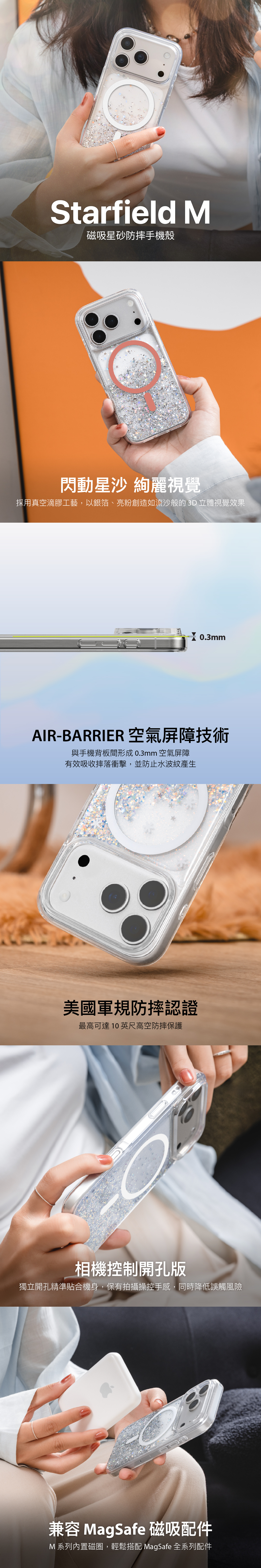 •AIR-BARRIER 空氣屏障技術:與手機背板間形成 0.3mm 空氣屏障,有效吸收摔落衝擊,並防止水波紋產生。