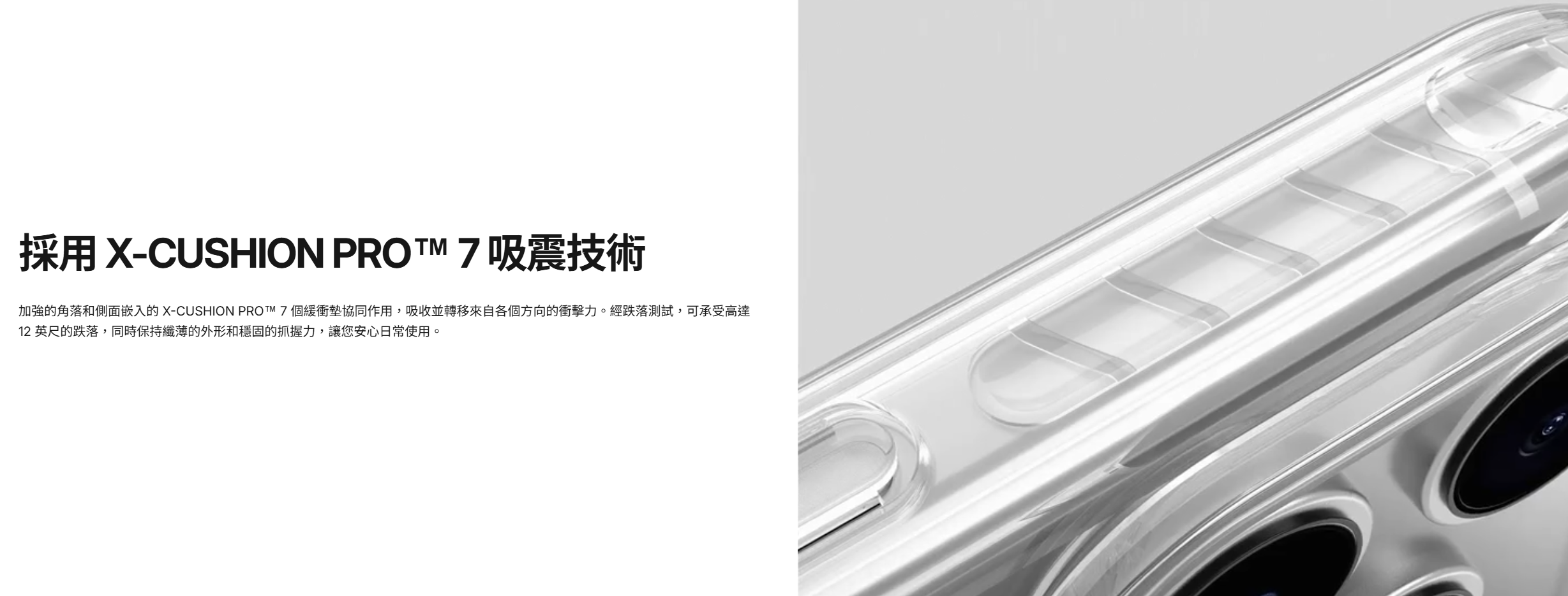 12 呎落摔防護,搭載 X-CUSHION PRO 7:強化四角與側邊內嵌 X-CUSHION PRO 7 氣墊,從各角度分散衝擊。通過最高 12 呎落摔測試,同時維持纖薄握感與穩固防滑手感。