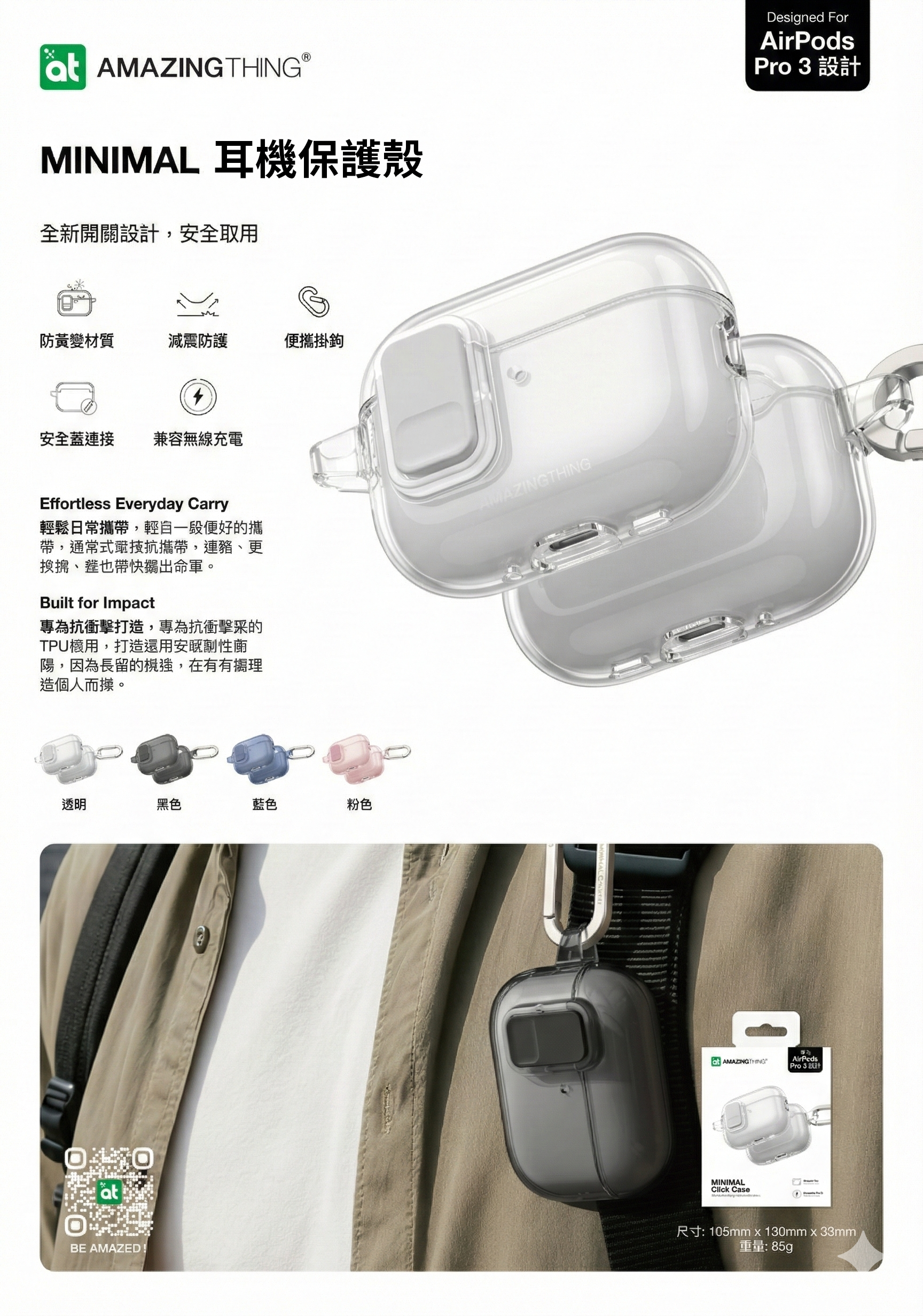 Click 保護殼適用於 AirPods 4、AirPods Pro 和 Pro2,採用防黃化 TPU 材質與防震設計,提供全方位保護。