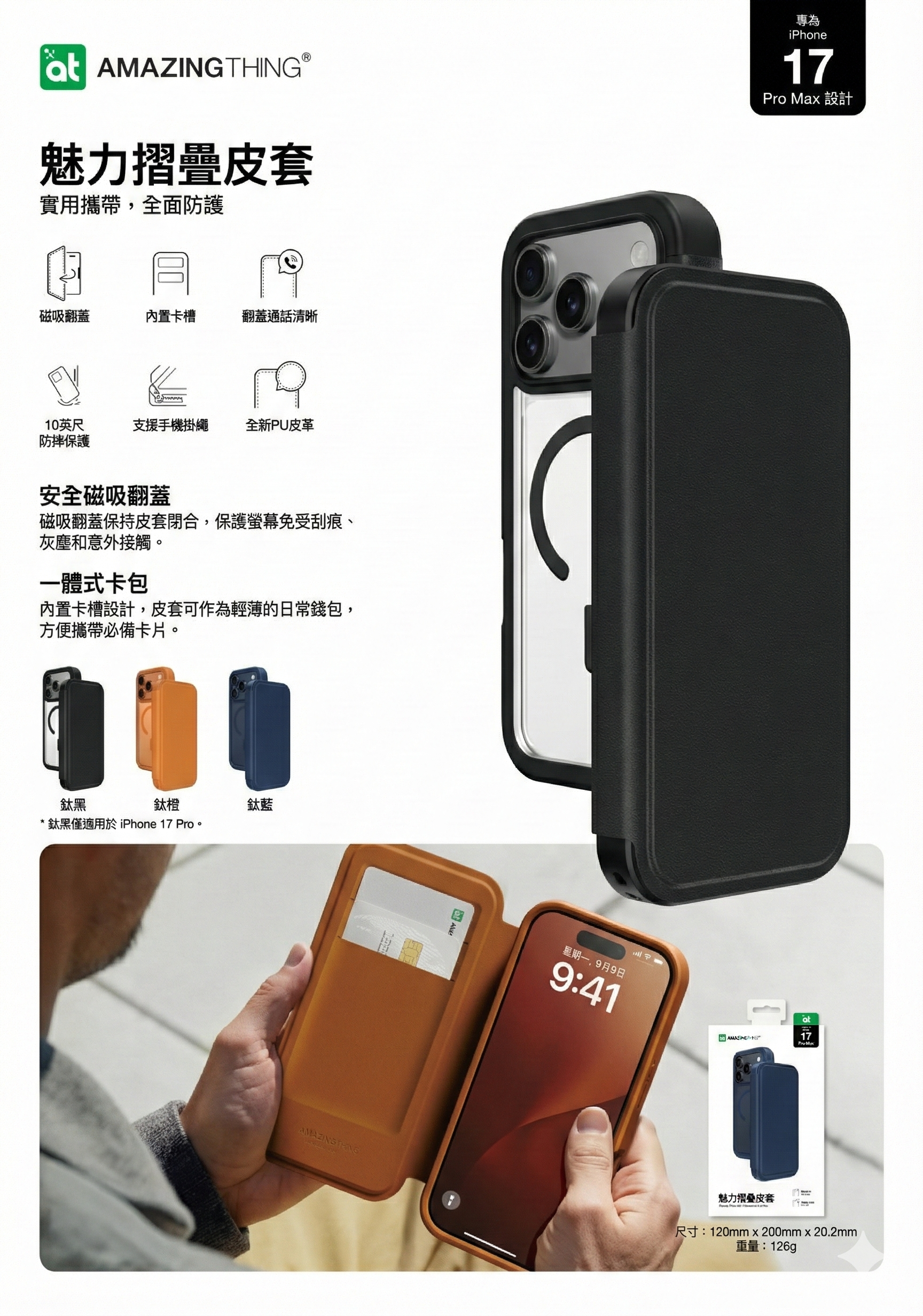 光滑的素皮質感表面支援 MagSafe 充電,保持輕薄有型,適合日常使用.