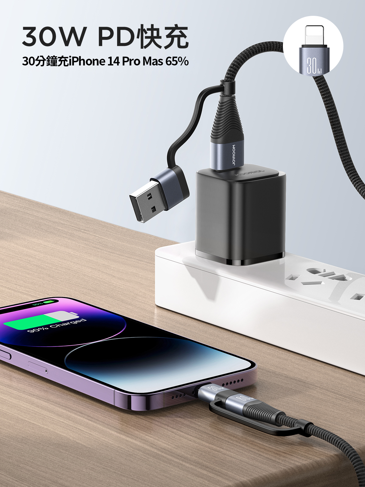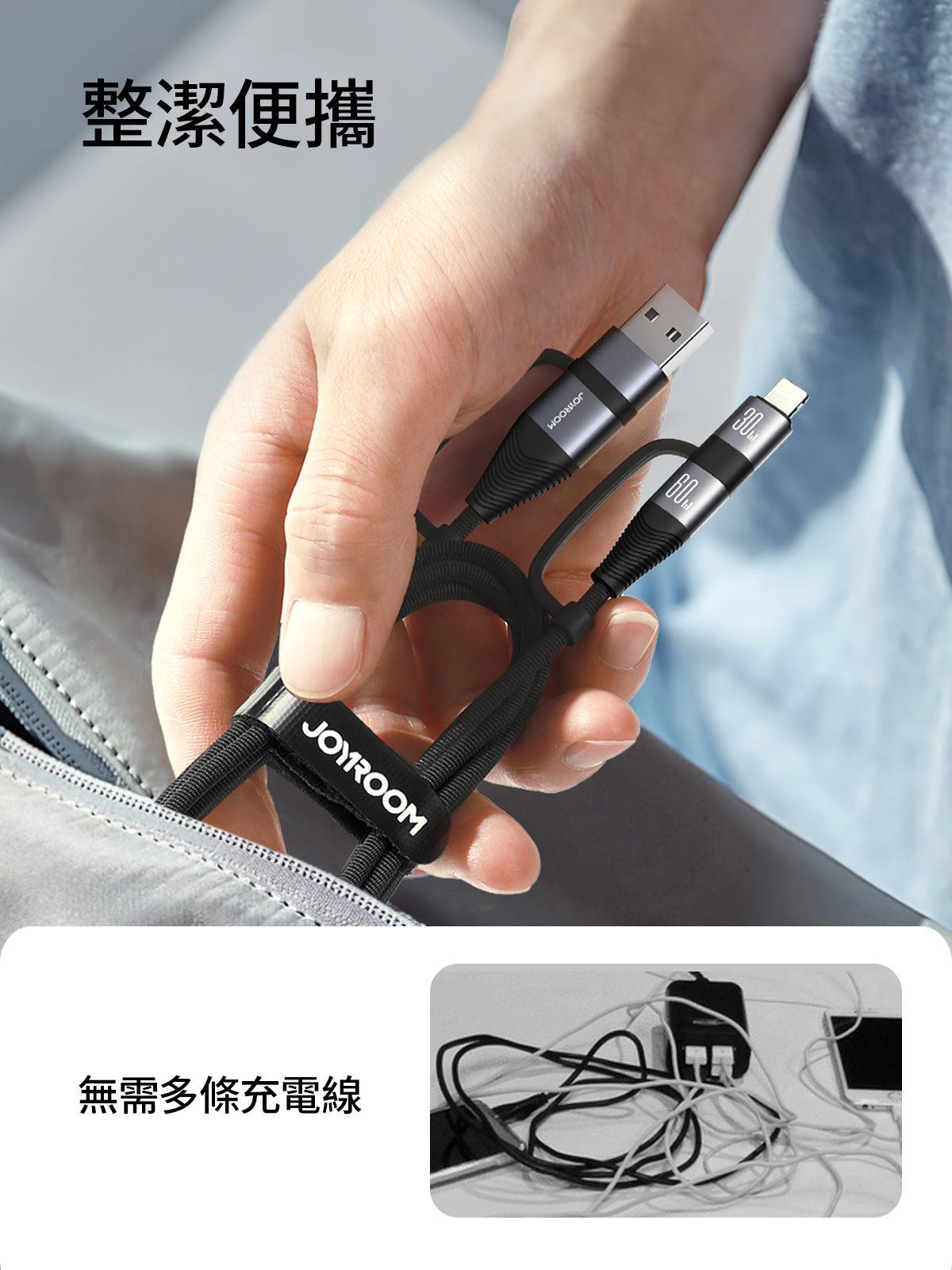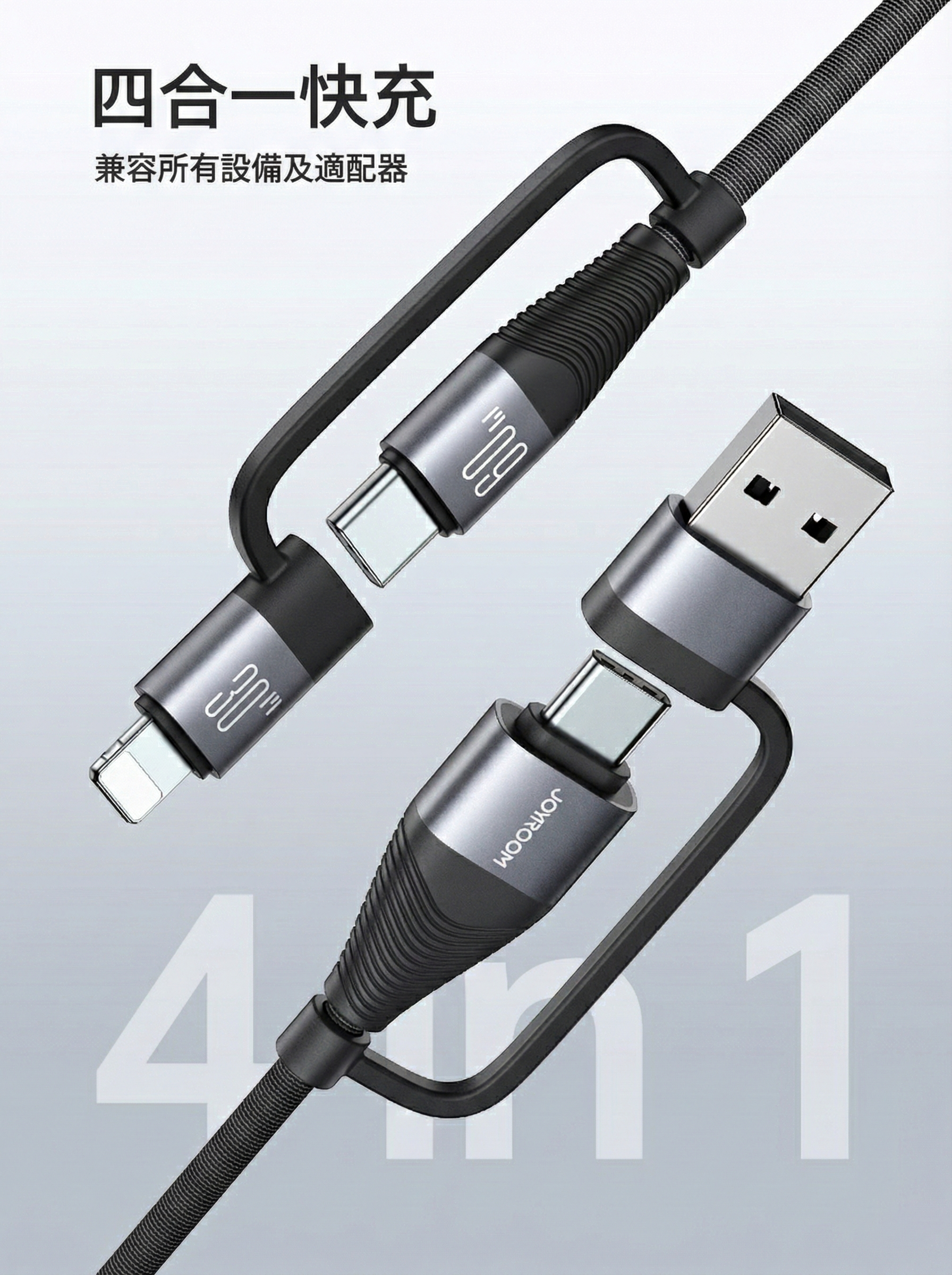 1.四合一設計,滿足手機、平板、筆記本、switch等快充需求,相容PD/USB充電器;