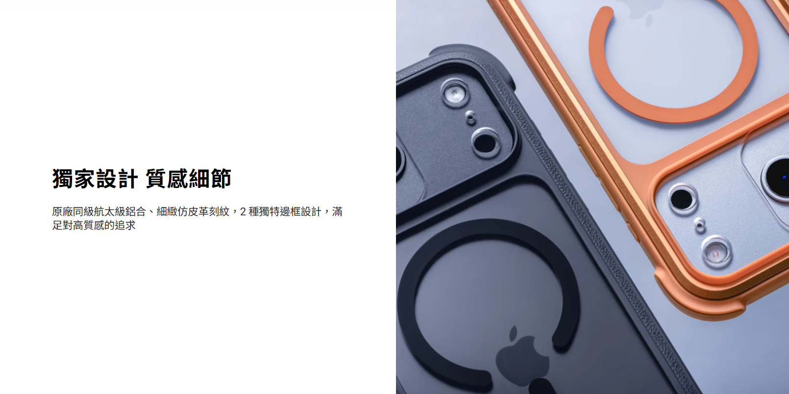 •原廠同級航太級鋁合、細緻仿皮革刻紋,2 種獨特邊框設計,滿足對高質感的追求。