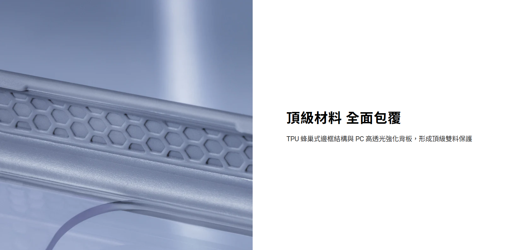 •頂級材料TPU 蜂巢式邊框結構與 PC 高透光強化背板,頂級雙料全面包覆保護。