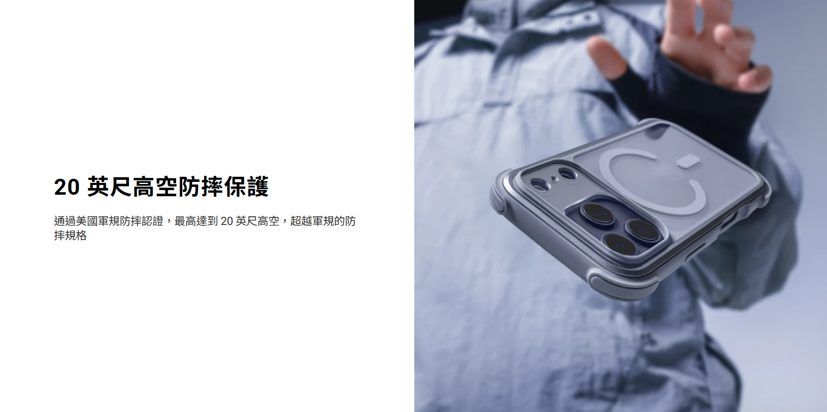 •通過美國軍規防摔認證,最高達20 英尺高空防摔保護,超越軍規的防摔規格。