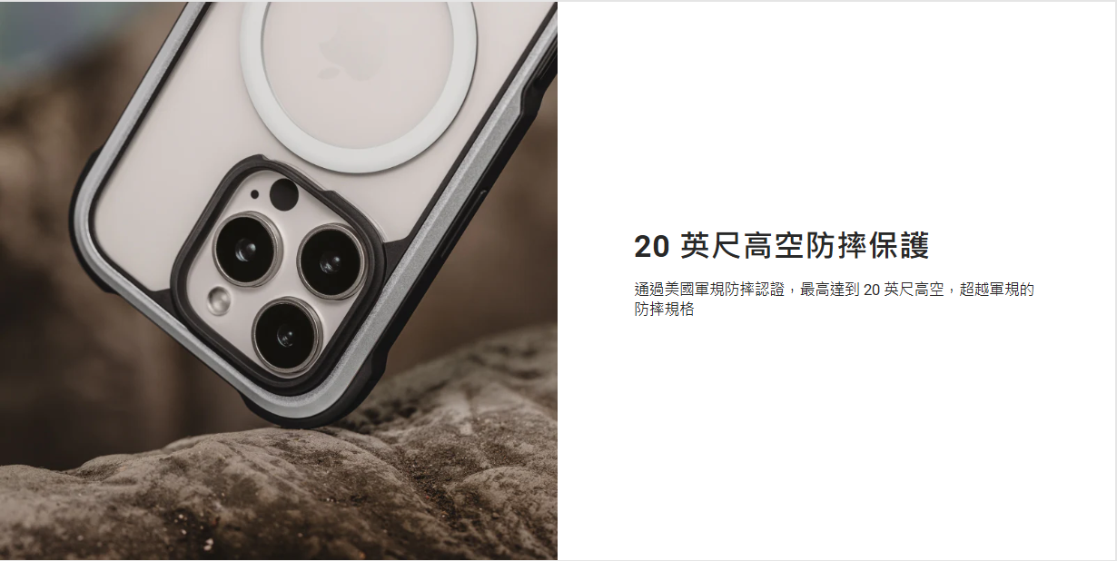 通過美國軍規防摔認證,最高達到 20 英尺高空,超越軍規的防摔規格。