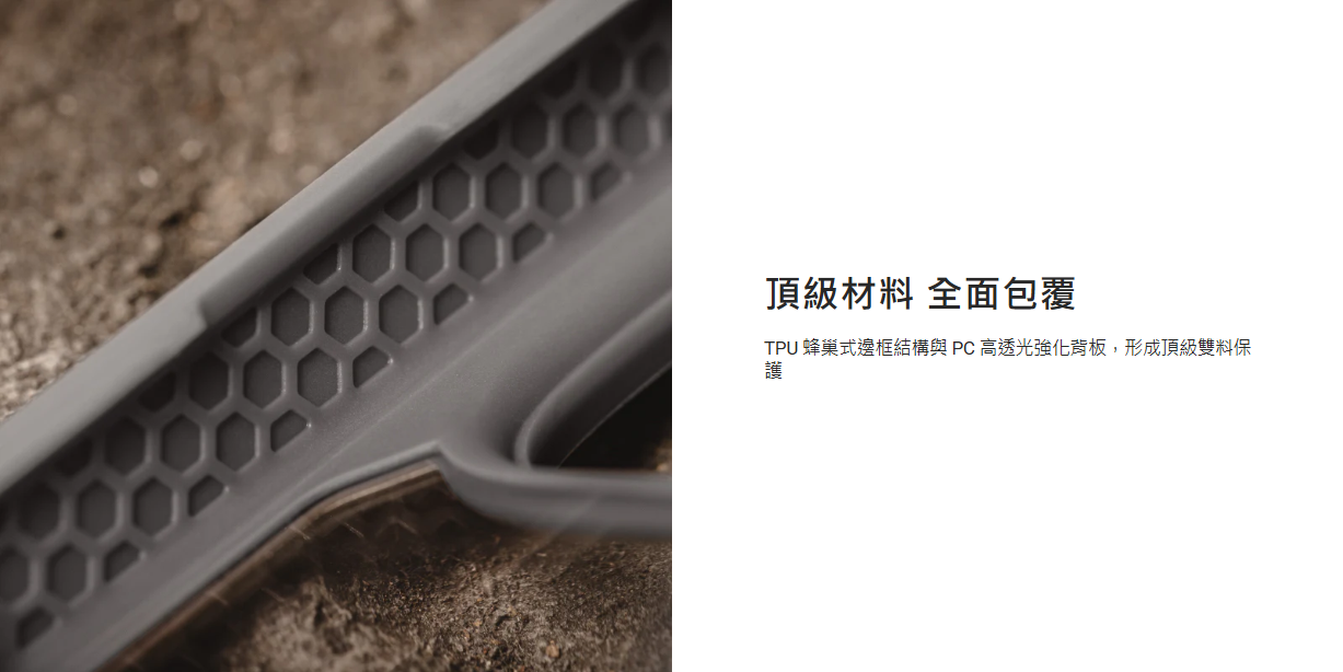 TPU 蜂巢式邊框結構與 PC 高透光強化背板,形成頂級雙料保護。