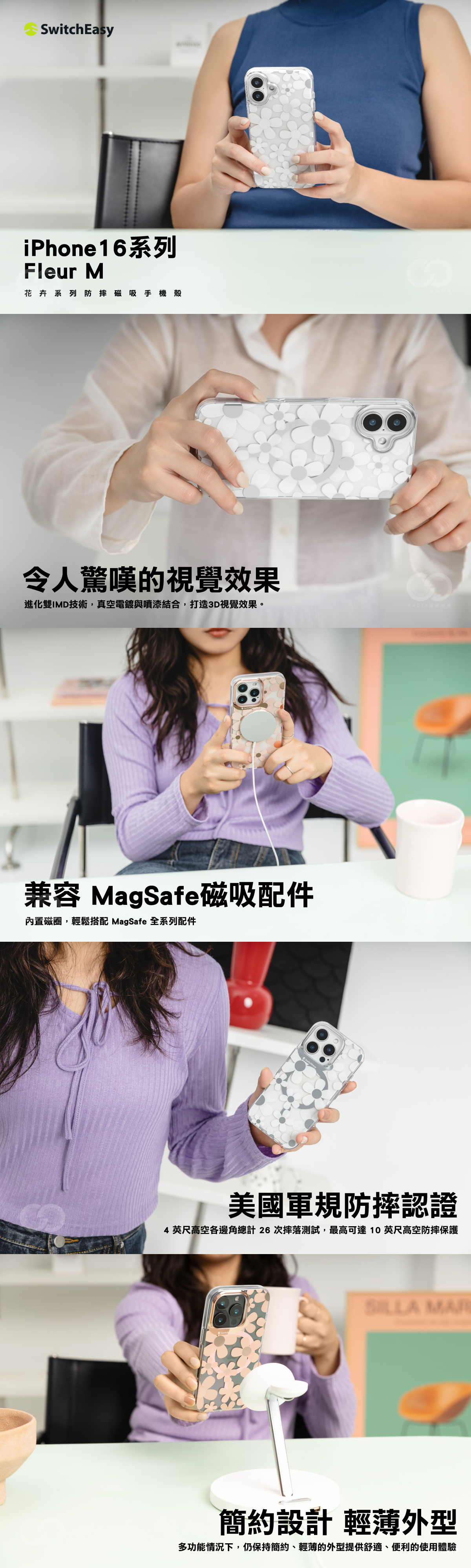 ◇產品介紹●多款精緻且不易掉色的圖案選擇●雙層 IMD 膜內裝飾技術,製造 3D 立體視覺效果●AIR-BARRIER 空氣屏障,有效吸收衝擊,防止手機背板破裂● 通過美國軍規防落摔測試,最高可達 10 英尺高空防摔保護●M 系列內置磁圈,支援 MagSafe 全系列配件