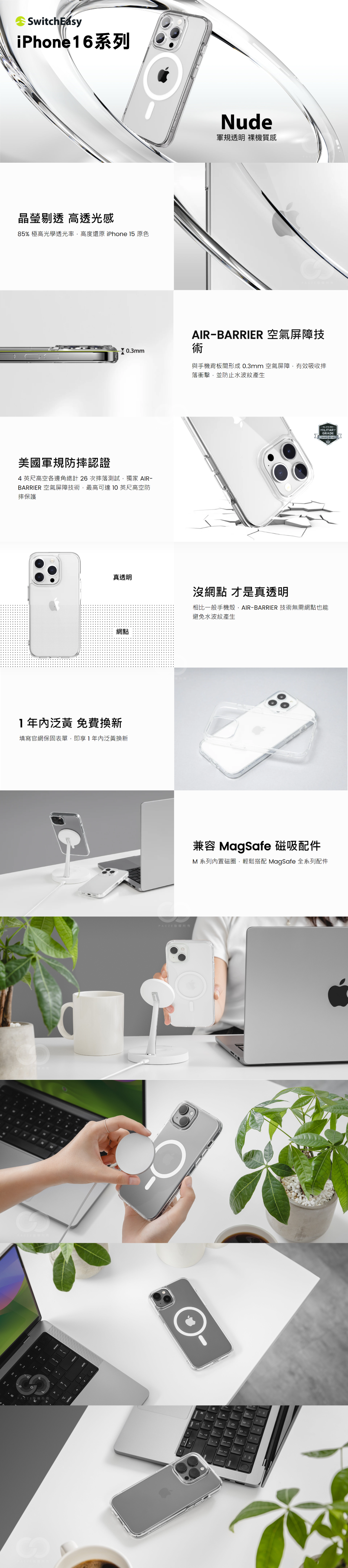 ◇產品介紹●AirBarrier空氣屏障設計,0.3mm手機背板空間氣囊,有效吸收衝擊,並防止水波紋產生●內嵌環狀多極性磁石模組,兼容所有 MagSafe 配件●高達85%的光學透光率,還原iPhone的原始之美●軟硬結合的2合1設計,帶來更好的手感及保護能力●硬化處理的材料,提供更長的使用壽命6. 支援所有MagSafe相關週邊配件