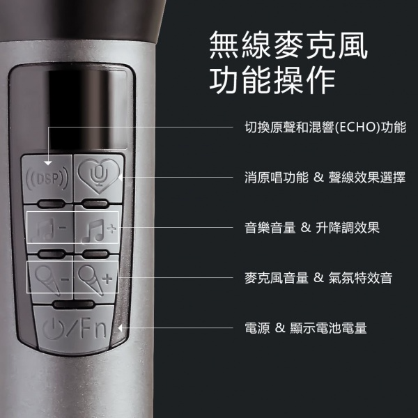 提供5段專業混響及3種美音效果,展現您優美的歌聲